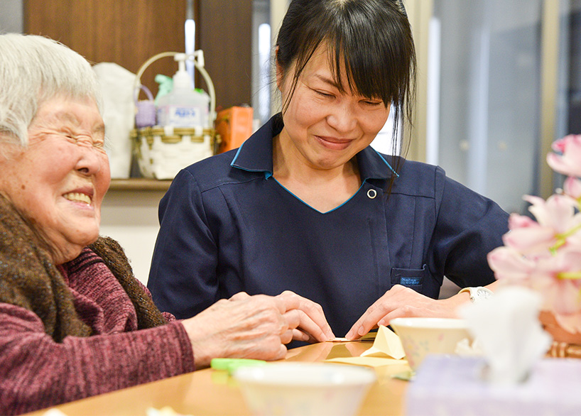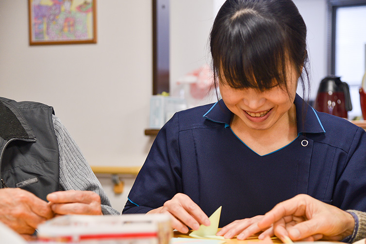フォレスト真野・さくら会で働くようになって、2019年12月で丸5年が経ちました。きっかけは、新規オープンの求人です。新しいところで、みんなでつくりあげる雰囲気に惹かれました。最初に働いた別の特養は、排泄介助や食事介助、終身介助、入浴介助と、時間に追われることが多かったですね。もう少し高齢者の方とゆったり接することができる働き方が良いと思い、有料老人ホームを選択しました。